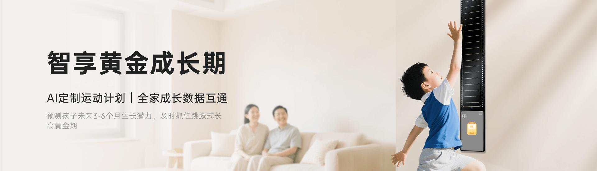 创新结合墙挂式感应测量仪,一体化设计实现身高精准测量与数据自动同步,家长可查看运动数据、身高曲线及营养报告,可以远程掌握孩子成长状态。产品兼顾儿童使用乐趣与家长科学管理需求,以“趣味+科技”双引擎打造沉浸式助高体验,为家庭提供一站式的身高健康管理解决方案。